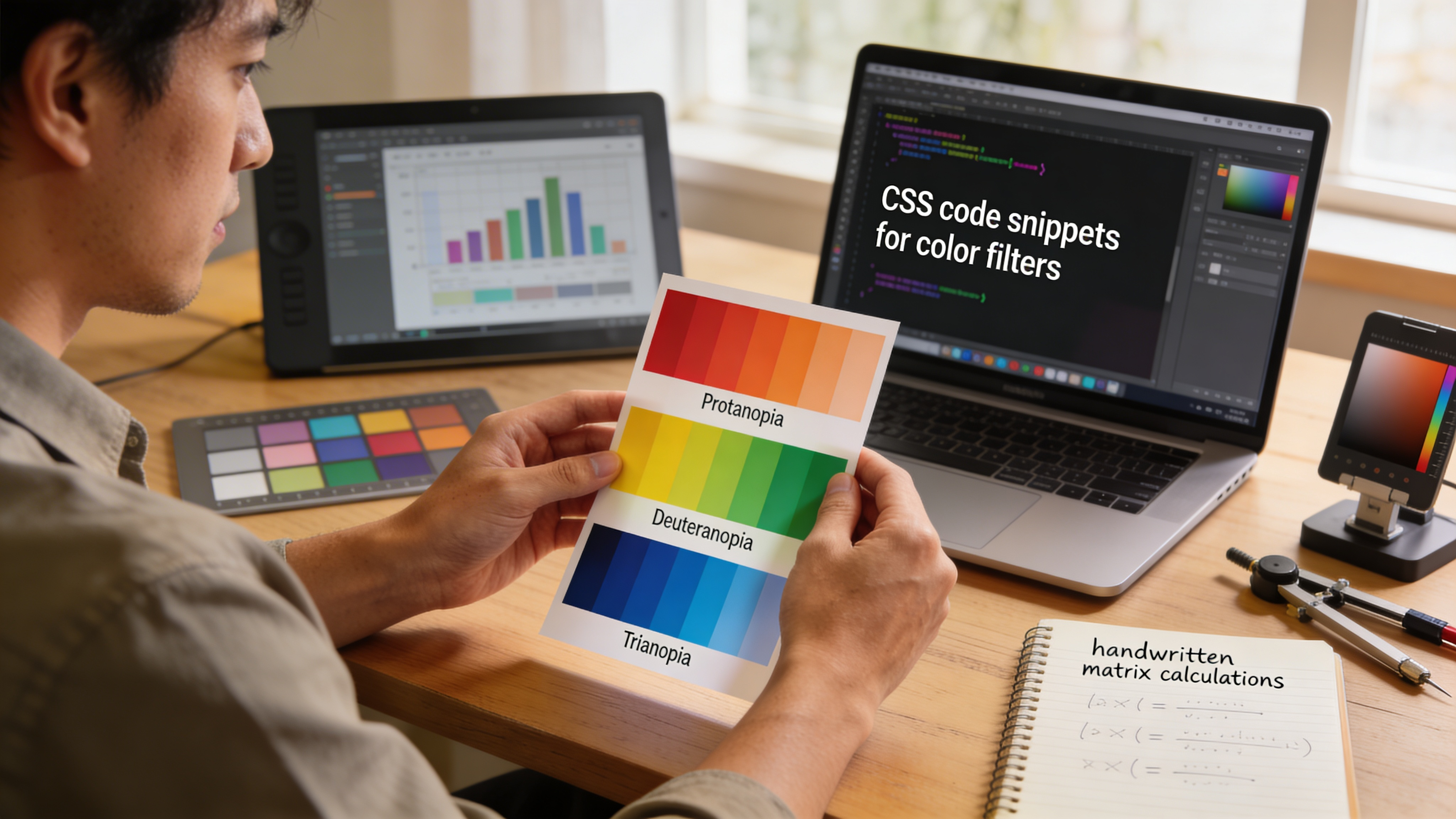 Learn CSS filters, blend modes, and programmatic CVD simulation techniques to test color accessibility during development. Practical code examples for protanopia, deuteranopia, and tritanopia.
